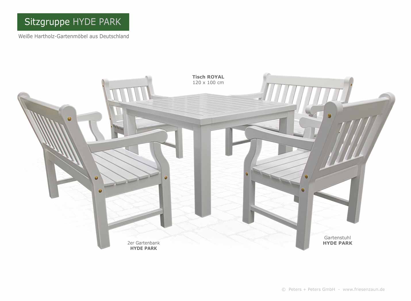 leichteren Gartenmöbel-Sitzgruppe im Windsor-Stil erfüllen. Die Holzgartenbänke Hyde Park nehmen die Formensprache der Gartenbänke Windsor auf, sind aber in der gesamten Ausführung deutlich leichter, wirken filigraner und lassen sich aufgrund des geringeren Gewichtes auch sehr gut als wetterfeste Gartenmöbel-Sitzgruppe einsetzen. Auch direkt am Haus neben der Eingangstür platziert wirken diese schönen Holzbänke dezent und harmonisch.