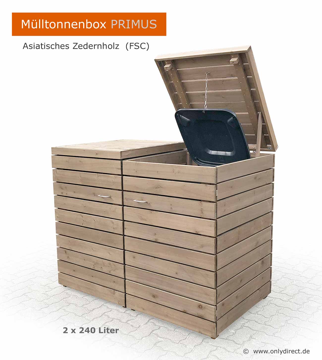Die extra stabile und formschöne Mülltonnenbox PRIMUS wird aus asiatischem Zedernholz gefertigt. Dieses FSC Plantagenholz (Cunninghemia lanceolata) hat einen sehr hohen natürlichen Widerstand gegen Schimmel, Ungeziefer und Holzfäule.