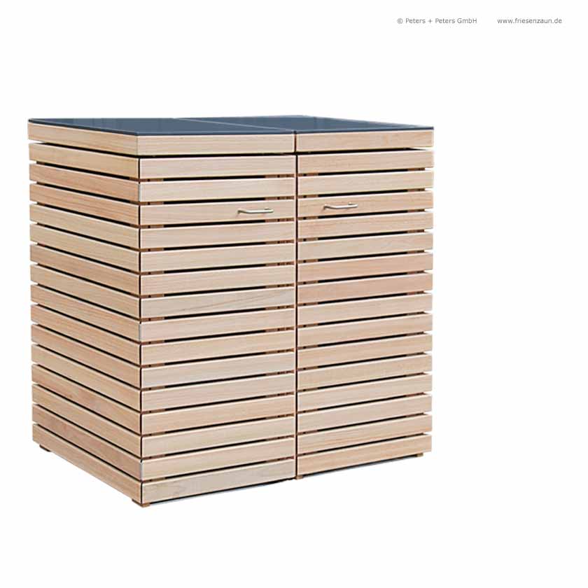 Die Mülltonnenbox CUBUS wird aus quasi astfreiem, extra massivem FSC-Eukalyptus Hartholz (1. Sortierung) gefertigt. Die Premium-Verarbeitung wird auch Sie begeistern. Die Rahmen der Mülltonnenbox sind aufwendig gezapft und gedübel. Die waagerechten Leisten werden von außen unsichtbar mit jeweils 4 Schrauben aus rostfreiem Edelstahl mit dem Rahmen von innen verschraubt. Für eine einfache Bedienung ist jeder Deckel mit jeweils 2 Gasdruckfedern ausgestattet.