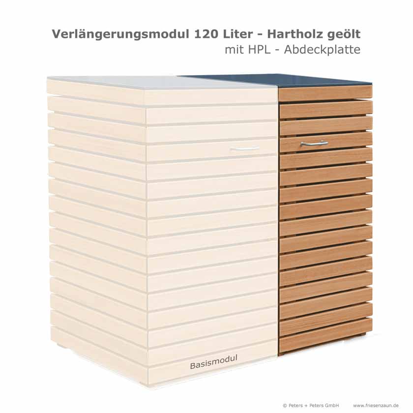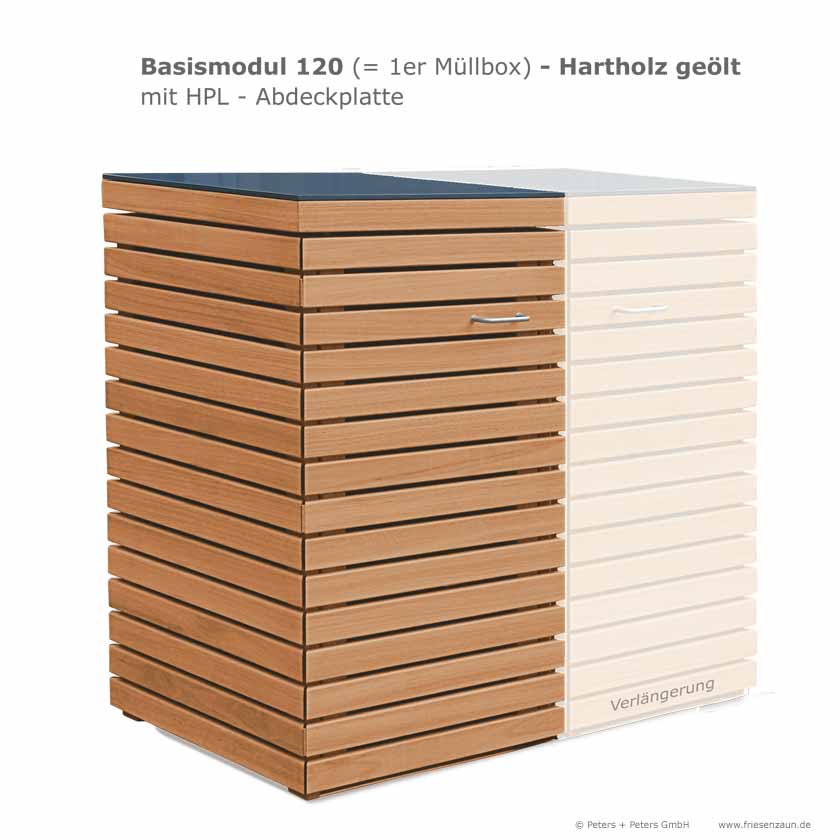 Für eine noch hochwertigere Erscheinung sorgen die optional erhältlichen HPL-Deckel-Abdeckplatten (HPL=High Pressure Laminate - Farbton: anthrazit). HPL ist absolut wasserdicht und schützt die Mülltonnenbox und deren Inhalt zusätzlich. Bei Bestellung einer Mülltonnenbox mit HPL-Abdeckplatten werden diese werksseitig auf dem Deckel montiert geliefert.