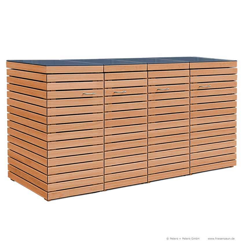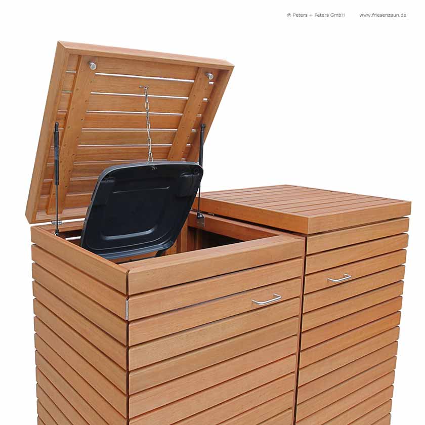 Die Mülltonnenbox CUBUS wird aus quasi astfreiem, extra massivem FSC-Eukalyptus Hartholz (1. Sortierung) gefertigt. Die Premium-Verarbeitung wird auch Sie begeistern. Die Rahmen der Mülltonnenbox sind aufwendig gezapft und gedübel. Die waagerechten Leisten werden von außen unsichtbar mit jeweils 4 Schrauben aus rostfreiem Edelstahl mit dem Rahmen von innen verschraubt. Für eine einfache Bedienung ist jeder Deckel mit jeweils 2 Gasdruckfedern ausgestattet.