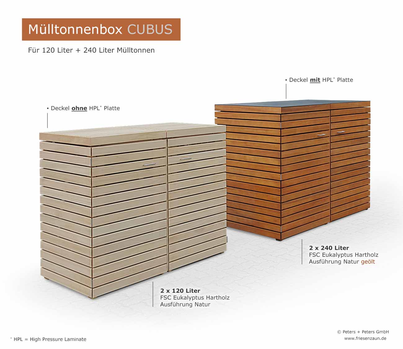 Die Mülltonnenverkleidung CUBUS gibt es als Mülltonnenbox 120 für Abfallbehälter bis 120 Liter Inhalt und als Mülltonnenbox 240 für Abfallbehälter bis 240 Liter Inhalt. Abfalltonnen mit 120 Liter Inhalt passen natürlich auch in die Mülltonnenbox CUBUS 240 - lediglich die Verbindungskette zwischen Mülltonnendeckel und Tonnendeckel muß etwas länger sein. Bitte geben Sie bei der Bestellung die benötigte Anzahl längerer Ketten an - wir liefern Ihnen diese gerne gratis mit.