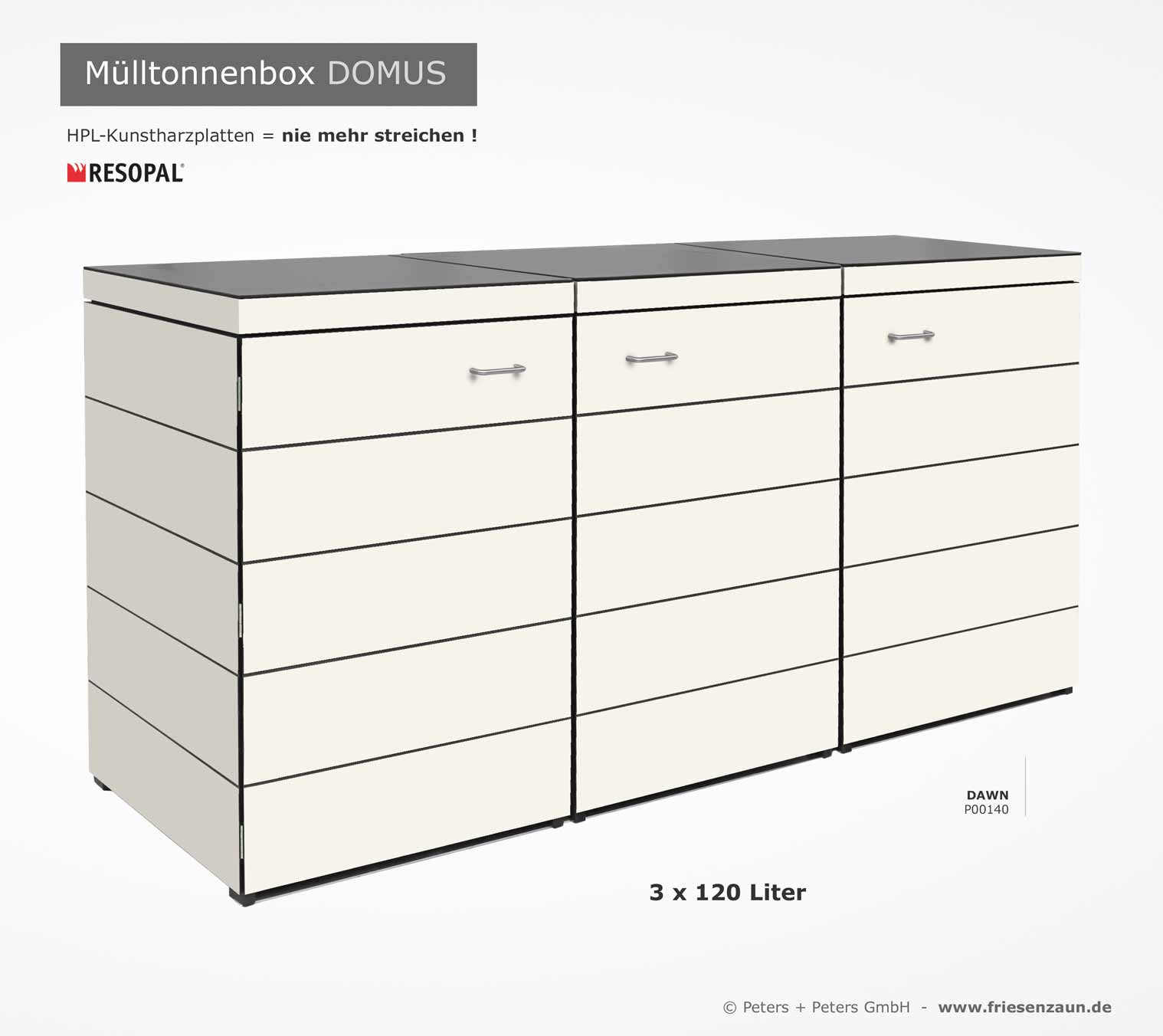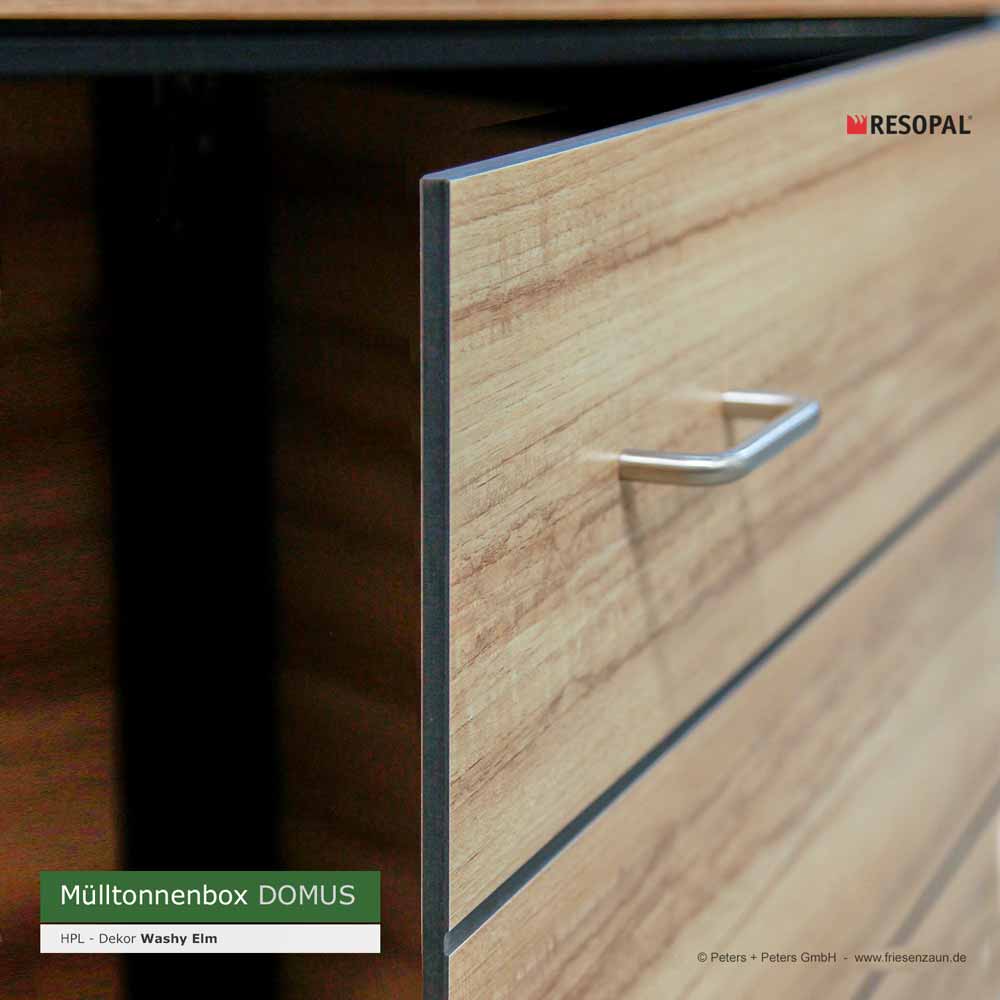 Eine neue Dimension - Die innovativen Mülltonnenboxen DOMUS werden aus 8 mm starken HPL-Dekorplatten der Firma RESOPAL gefertigt. HPL steht für High Pressure Laminate und bezeichnet ein äußerst wiederstandfähiges Plattenmaterial aus hochverdichtetem Kunstharz. Diese absolut witterungsbeständigen und wartungsfreien Platten sind ursprünglich für das Verkleiden von Hausfassaden entwickelt worden und bieten aufgrund der besonderen Eigenschaften ein hervorragendes Ausgangsmaterial auch für langlebige Mülltonnenboxen. HPL hat einen schwarzen Kern und ist in vielen modernen Farben und Dekoren erhältlich. Der schwarze Kern ist an den Kanten und den gravierten Nuten sichtbar. HPL ist absolut wartungsfrei, unempfindlich gegen UV-Einstrahlung und muß nie nachgestrichen werden.