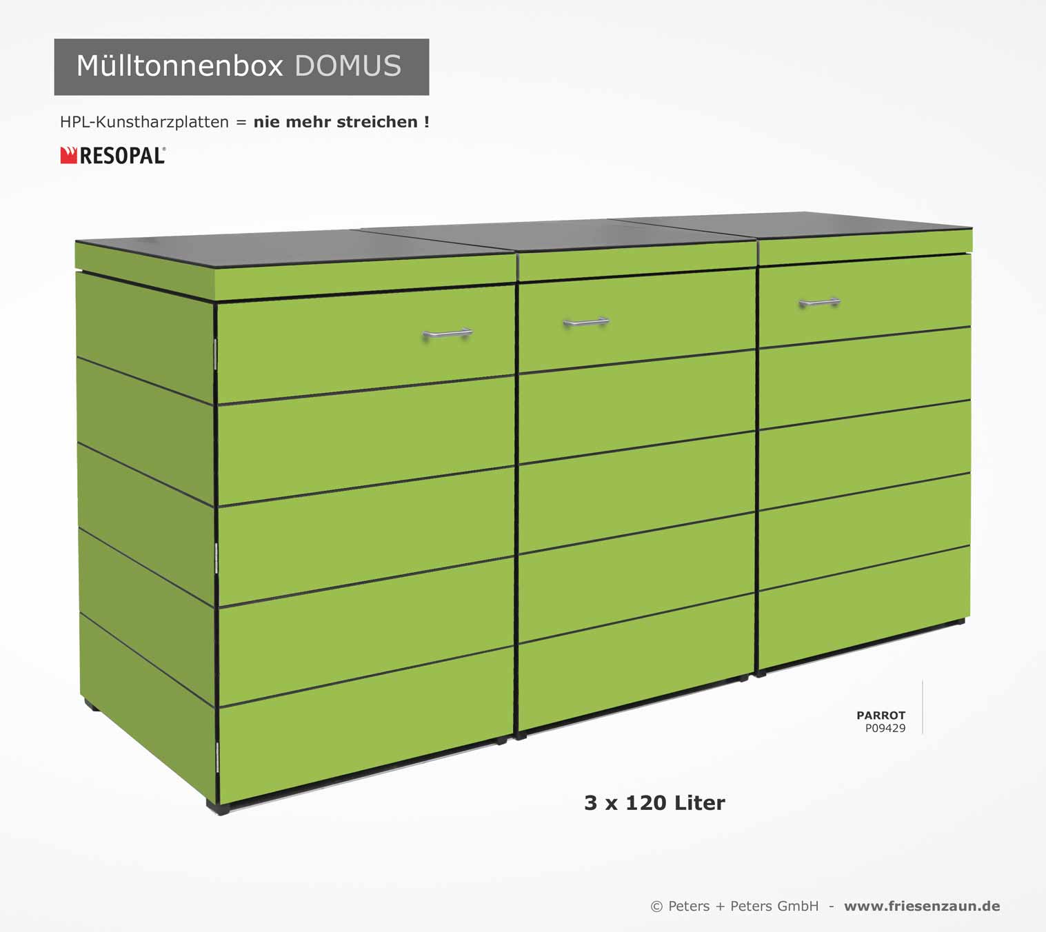 Die Mülltonnenbox DOMUS ist als 1er, 2er und 3er Mülltonnenbox bestellbar. Tonnenhäuser mit vier, fünf oder mehr Stellplätzen werden durch die Kombination entsprechender 2er und 3er Mülltonnenboxen erstellt. Die Mülltonnenbox DOMUS hat eine vollwertige HPL-Rückwand - daher ist eine freie Platzierung der Mülltonnenbox im Garten oder am Haus problemlos möglich.